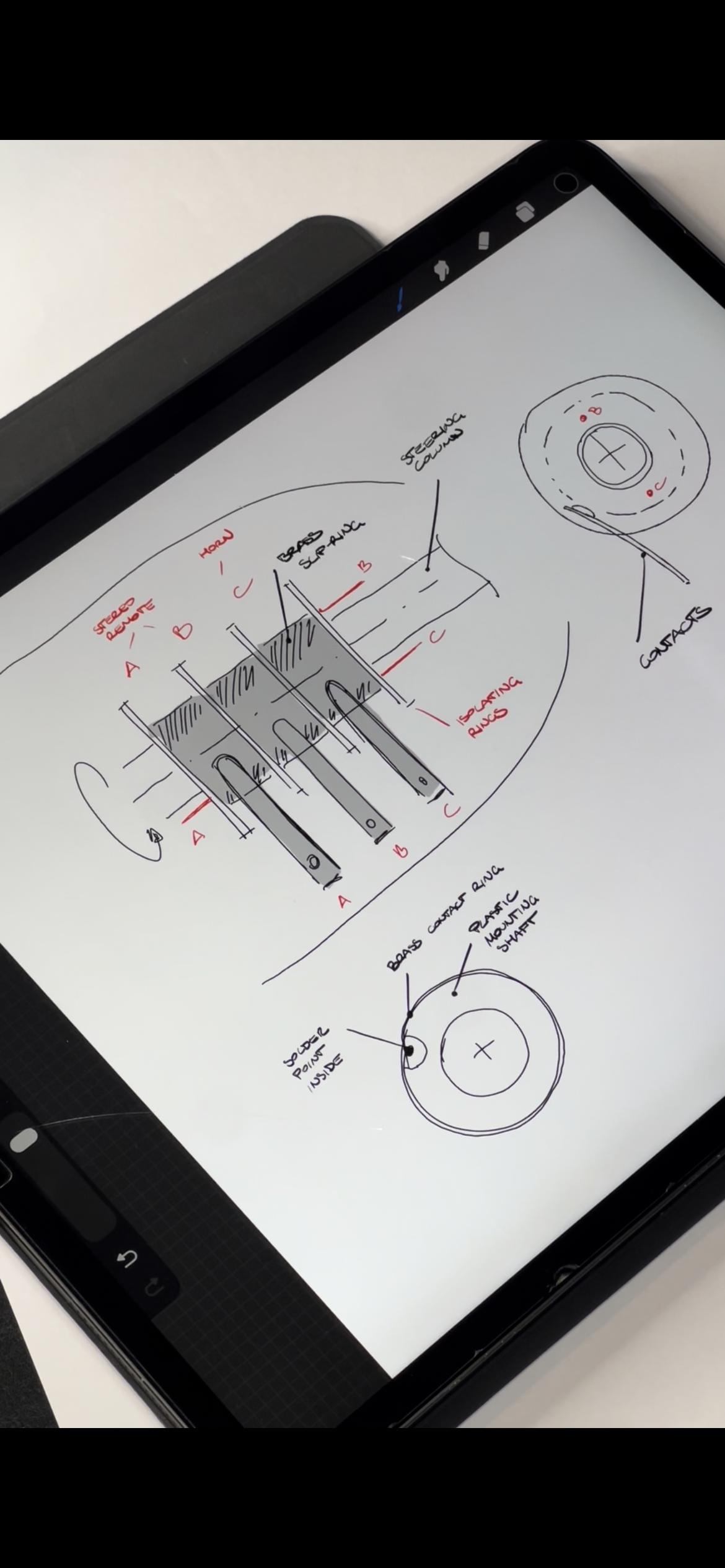 Ein erster Ansatz war eine Wickelfeder zu verwenden. Aufgrund des sehr begrenzten Platzes in der Lenksäule erwies sich diese Lösung jedoch als ungeeignet. Schließlich fiel die Wahl auf eigens angefertigte Schleifringe mit passenden Abnehmern, die eine kompakte und zuverlässige Übertragung der Signale ermöglichen.